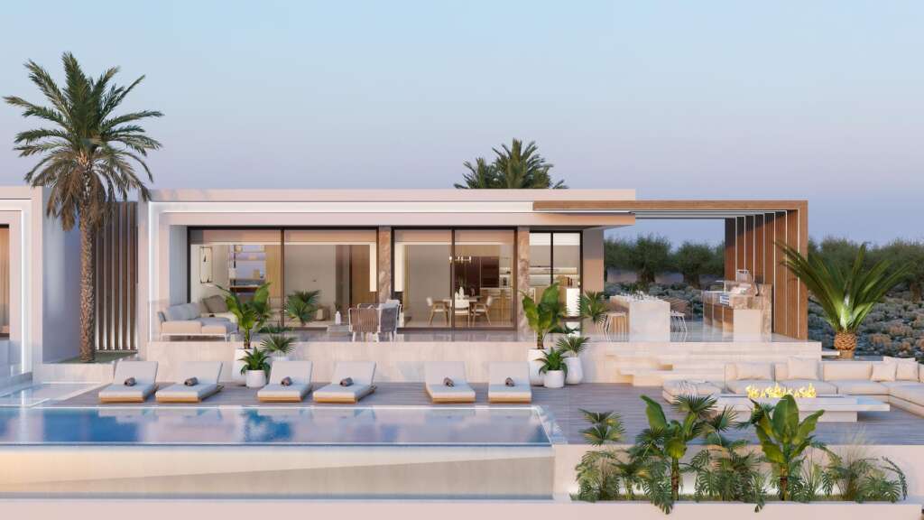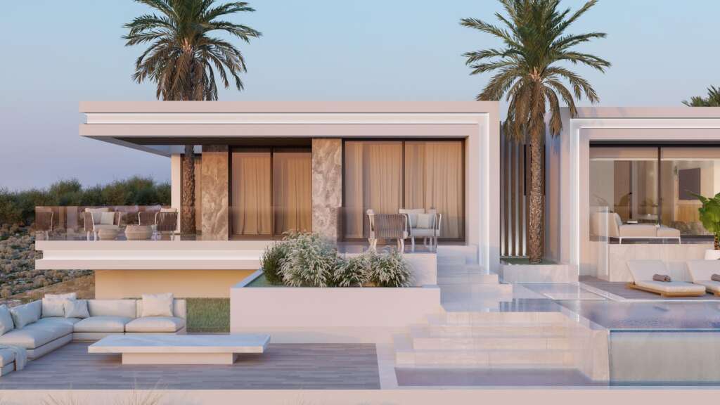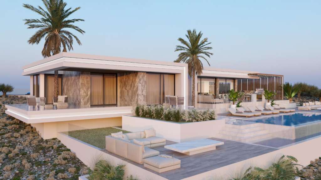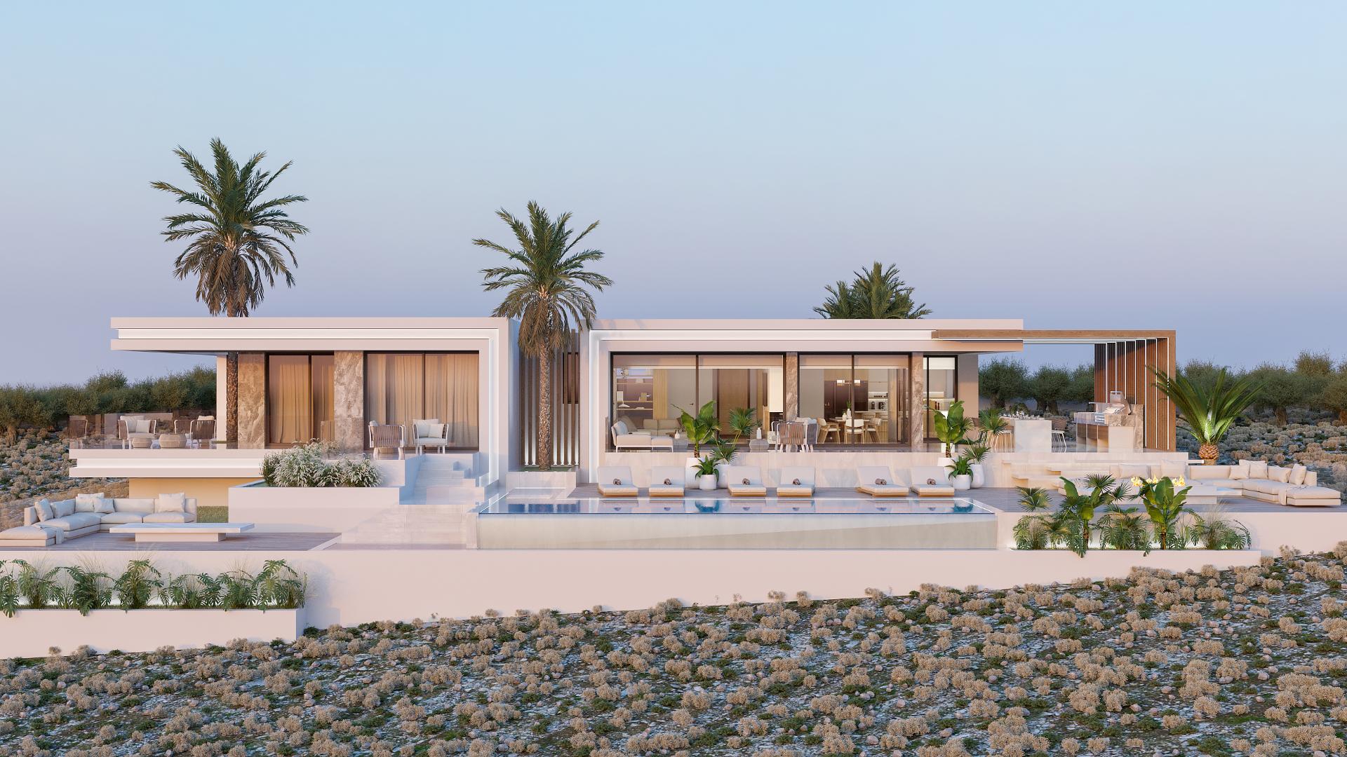 The study is about the construction of a ground-floor residence with a swimming pool in an area outside the village of Agia Marina.